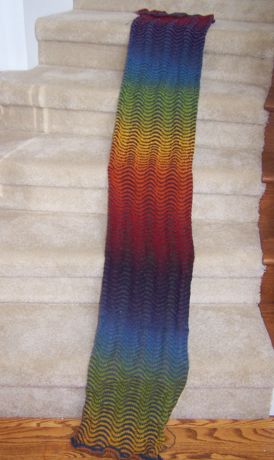 I finished up the Hitchhiker Scarf and I'm really pleased with the way that it finished up. I was concerned about the yarn, but I love the end result: